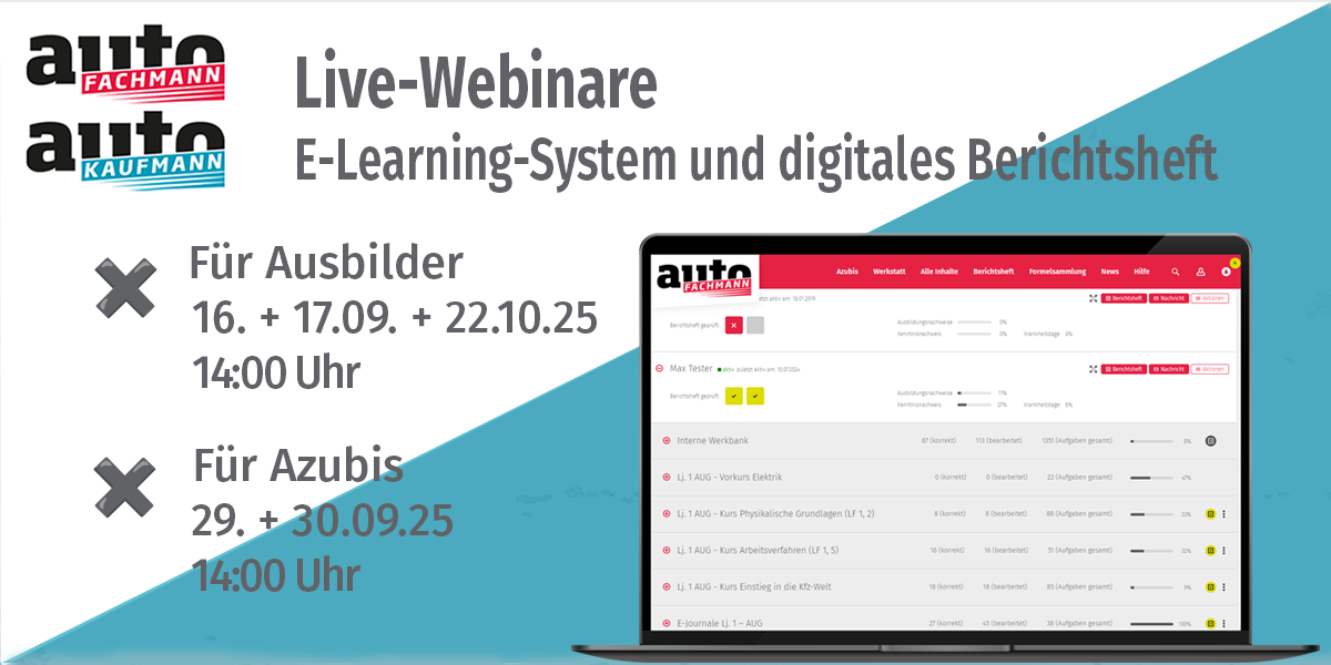 Im September finden vier Webinare, im Oktober findet ein Webinar zum E-Learning-System und digitalen Berichtsheft von autoFACHMANN und autoKAUFMANN statt.